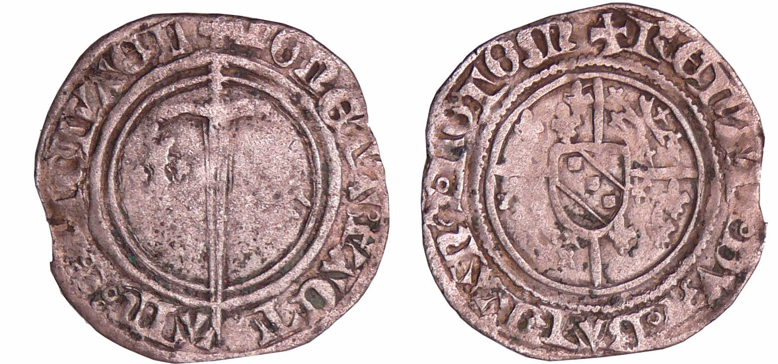 Avers : René 1er d’Anjou (1431-1455). A/ (lis) RENATI * DVX * BARR Z LOTOM Champ écartelé d’Anjou et de Bar. Un écusson de Lorraine brochant sur le tout.