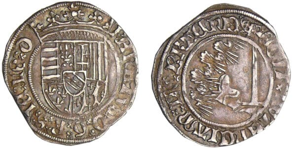 Avers : René II (1473-1508). A/ RENATVS D G R SI IE LOTH D. Ecu couronné parti de Lorraine et de Bar.