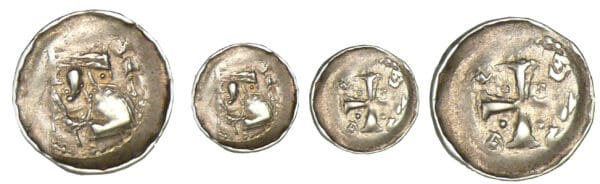R/ METENSIS. NETENSIS. Croix cantonnée de quatre points.