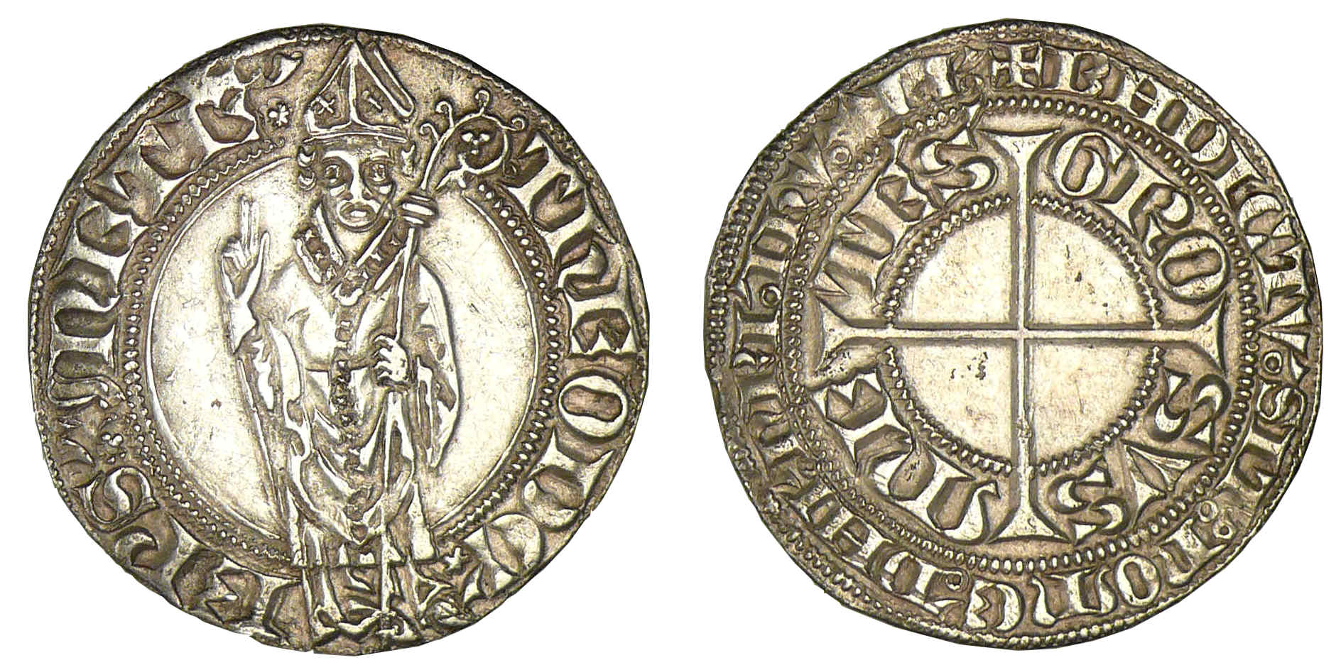 Avers : Thierry V de Boppard (74ème évêque) (1365-1384). A/ THEODC’ EPS METE. L’évêque debout de face, tenant une crosse et bénissant de la main droite.