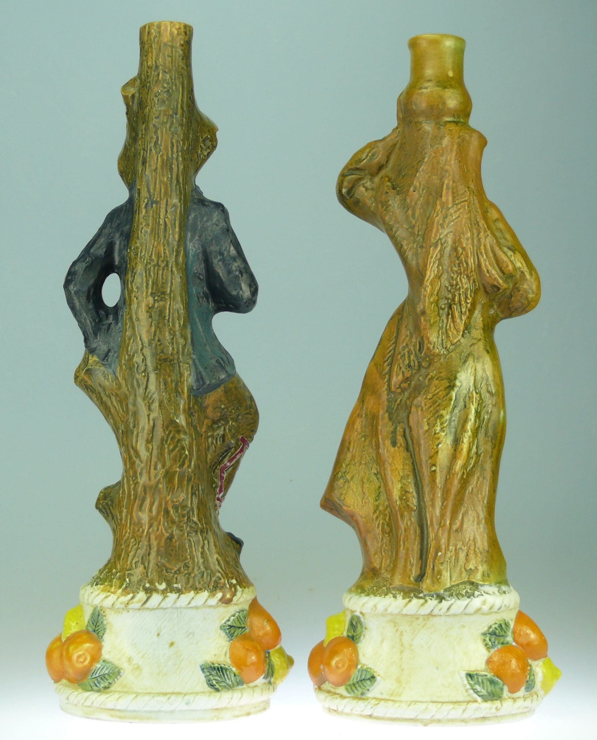 Avers : Ensemble de 2 belles bouteilles en céramique émaillée repésentant Un couple de paysans à la peau bronzée. La femme est vêtue d’une longue robe et d’un tablier vert. Elle porte un châle jaune sous le bras droit et une grosse cruche sur la tête. L’homme est assis sur un tronc et fume la pipe. Il est vêtu d’un ensemble marron et d’une veste bleue à bords blancs, un chapeau de forme conique recouvre sa chevelure brune. Les 2 bouteilles reposent sur des bases identiques, ornées d’oranges et de citrons avec leurs feuilles et d’un bouquet de fleurs contenu dans un cadre torsadé. Les bouchons sont à l’intérieur des bouteilles, on les entend quand on les secoue un peu. Respectivement 33 et 34 cm.