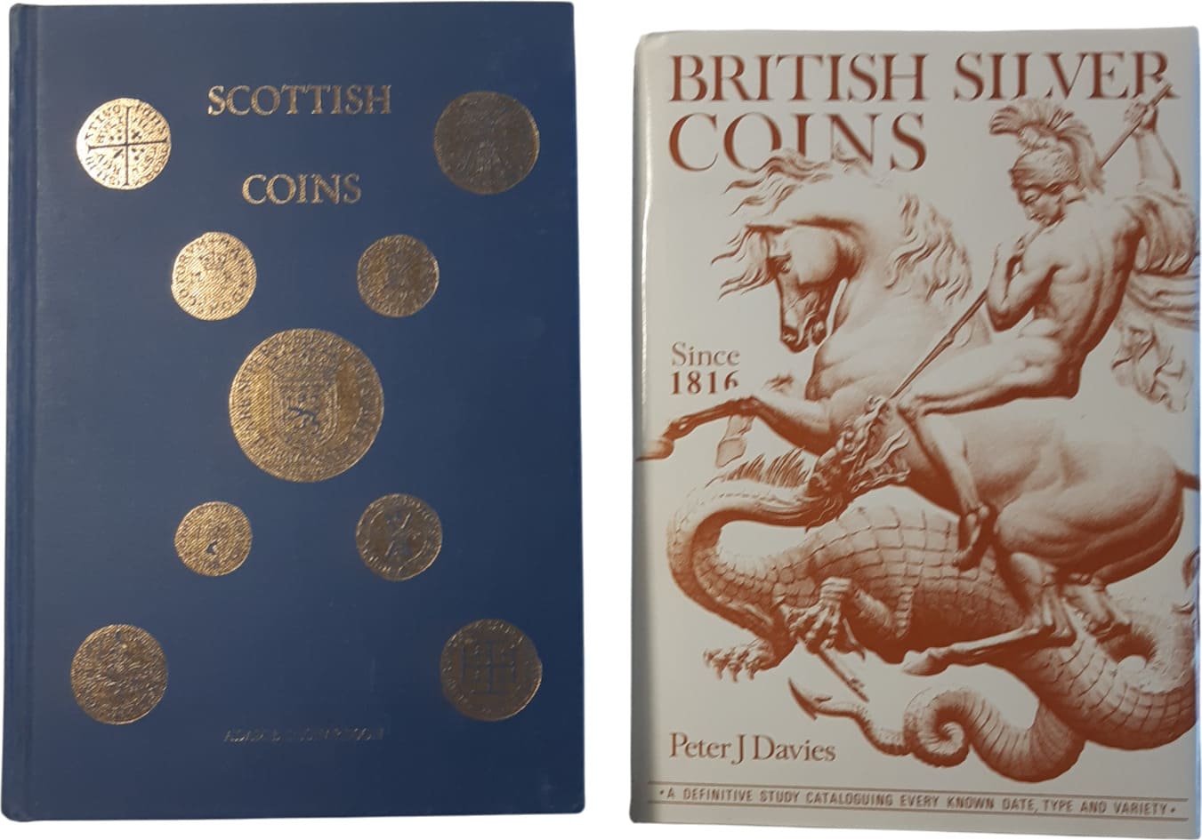 Avers : 1- Peter J. Davies – British silver coins since 1816 – 1982 – 128 pages de textes et dessins ; 2- Adam B. Richardson – Scottish coins – 1901 – 397 pages et 12 planches.