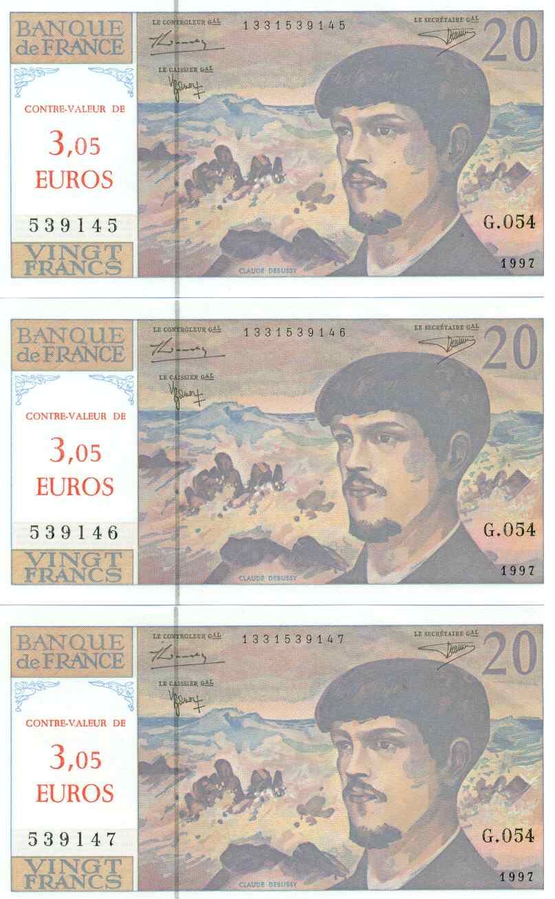 Lot de 3 billets de 20 francs Debussy 1997 – Surchargés d’une contremarque de 3.05 euros