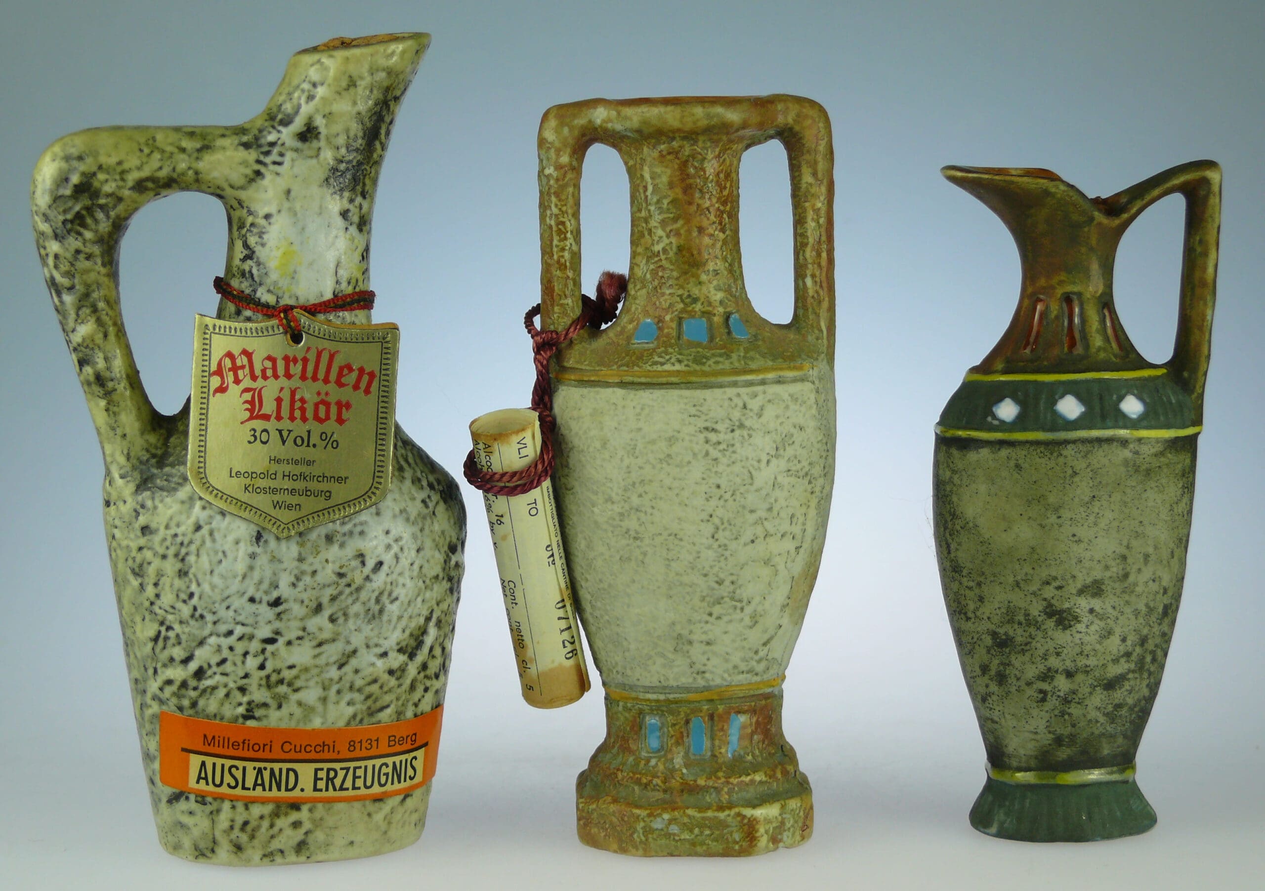 Avers : 1) – Bouteille miniature en céramique en forme de cruche à grande anse droite, la panse ornée d’une représentation de déesse vêtue d’un drapé, les bras tendus vers l’avant et d’une frise comprenant six petits losanges blancs. Le flacon a encore son bouchon mais le contenu a du finir par s’évaporer. Bouteille estampillée « Made Italy ». 2) Bouteille miniature en céramique en forme d’amphore sur base octogonale, la panse ornée d’une représentation de guerrier égyptien. La bouteille a une ancienne étiquette rattachée à la anse par une cordelette rouge. Flacon avec son bouchon et un reste de liqueur à l’intérieur. 3) – Bouteille miniature en céramique en forme de cruche à goulot penché, la panse ornée d’une représentation de chaman assis et de formes diverses dans des formes géométriques. Le flacon a une ancienne étiquette attachée au goulot par une ficelle rouge et une autre étiquette au dos. Bouteille avec son bouchon en liège et la liqueur à l’intérieur.Dimensions : 11.5 ; 12 et 13.5 cm.