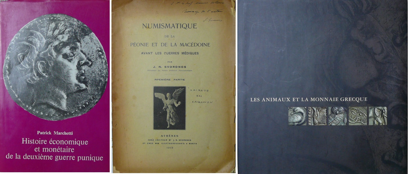 Avers : 1- Numismatique de la Péonie et de la Macédoine avant les guerres médiques, J. N. Svoronos, Athènes 1913 ; 2- Histoire économique et monétaire de la deuxième guerre punique, Patrick Marchetti ; 3- Les animaux et la monnaie grecque, Figures d’un art millénaire, Anne Demmester, 2003.