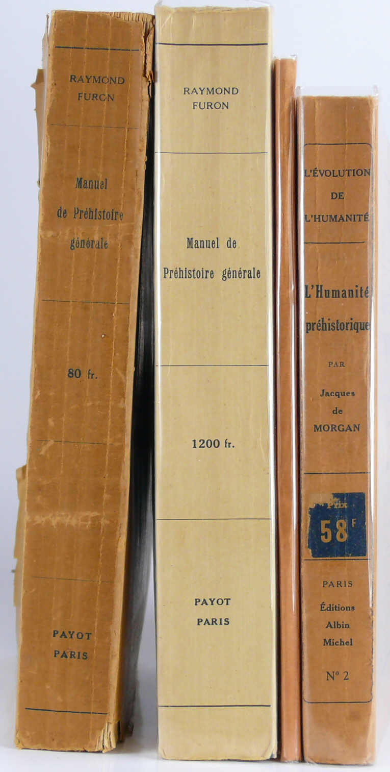Avers : 1) Manuel préhistorique générale par Raymond Furon de 1943. Ouvrage broché de 428 pages non découpées. 2) Manuel préhistorique générale de Raymond Furon de 1951. Ouvrage broché de 537 pages. 3) Initiation à la Préhistoire par S. Blanc de 1931. Ouvrage broché de 96 pages. 4) Histoire préhistorique par Jacques De Morgan de 1937. Ouvrage broché de 338 pages.