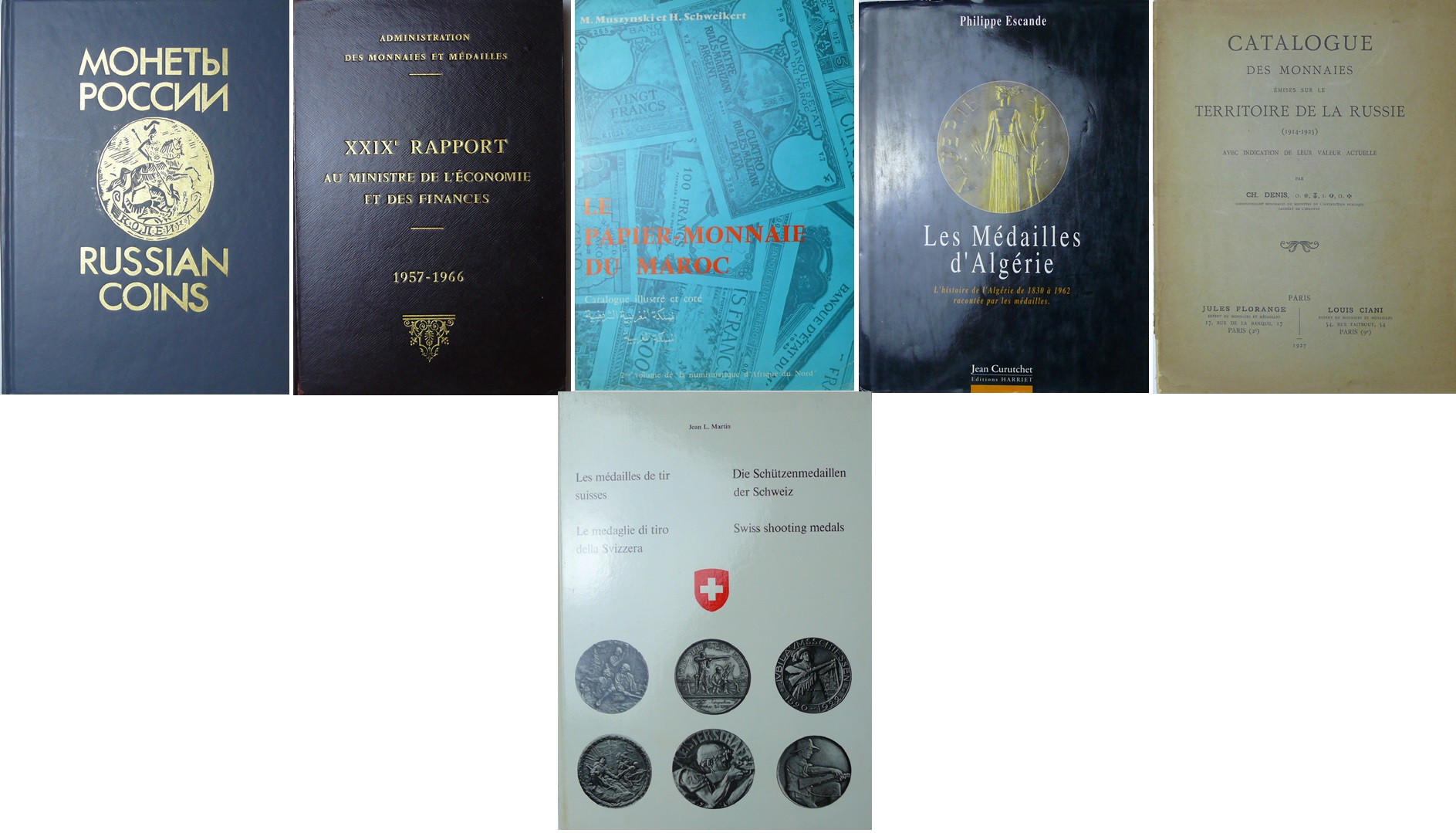 Avers : 1- Les médailles de tir suisses, Jean L. Martin ; 2- Les médailles d’Algérie, l’Histoire de l’Algérie de 1830 à 1962 racontée par les médailles, Philippe Escande ; 3- Le papier monnaie du Maroc, M. Muszynski et H. Schweikert, catalogue illustré et coté, 2ème volume de la numismatique d’Afrique du Nord ; 4- Administration des monnaies et médailles, XXIXème rapport au Ministre de l’Economie et des Finances 1957-1966 ; 5- Russian coins 1700-1917, V. V. Uzdenikov ; 6- Catalogue des monnaies émises sur le Territoire de la Russie (1914-1925) avec indication de leur valeur actuelle, CH; Denis, Paris 1927.