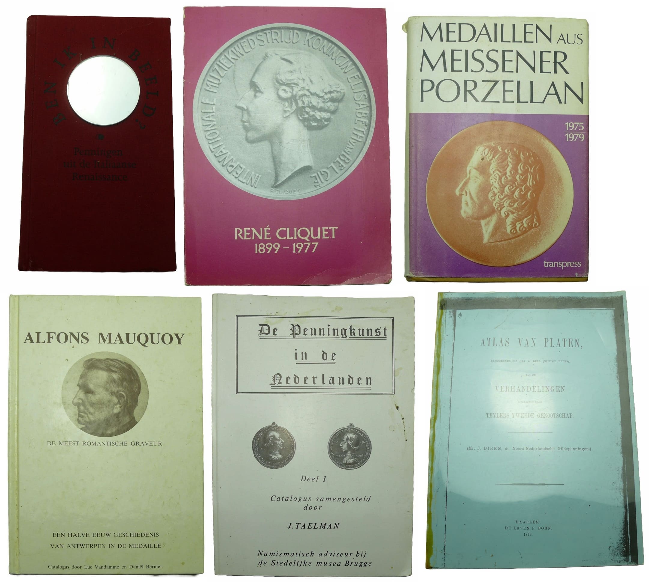 Avers : 1- Alfons Mauquoy, de meest romantische graveur ; 2- Medaillen aus meissener porzellan ; 3- René Cliquet, médailleur en Beeldhouwer ; 4- De penningkunst in de Nederlanden, deel I ; 5- Atlas van platen ; 6- Penningen uit de Italiaanse Renaissance