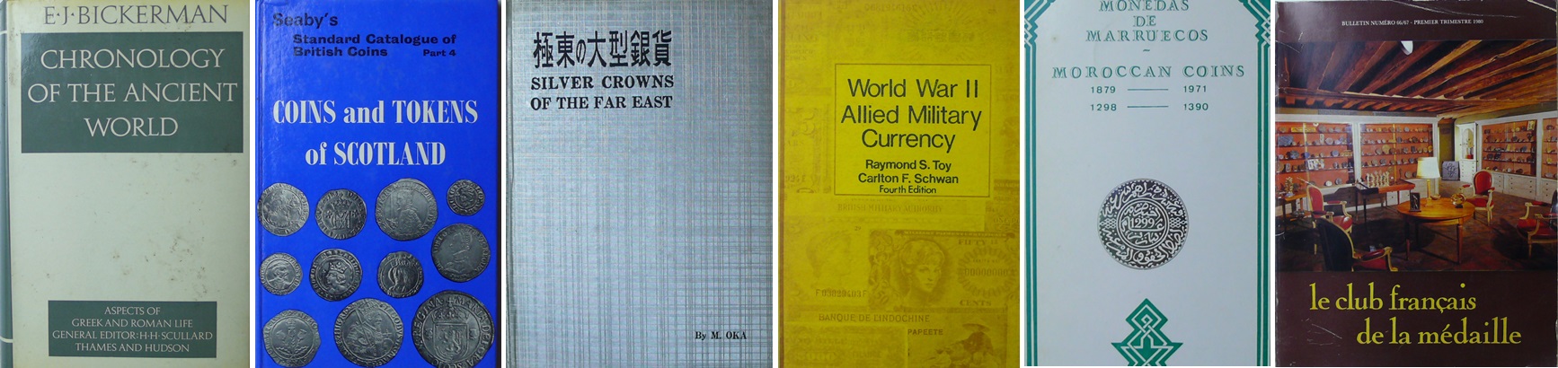 Avers : 1- Chronology of the ancient world, E. J. Bickerman 1968 ; 2- Coins and tokens of Scotland, Standard catalogue of british coins, part 4, first edition 1972 ; 3- Silver crowns of the Far East, M. Oka 1966 ; 4- World War II, Allied military currency, Raymond S. Toy, Carlton F. Schwan, fourth edition 1974 5- Monedas de Marruecos, moroccan coins 1879-1971, José M. Sanchez-Giron Blasco, Ceuta 1972 ; 6- Le club français de la médaille, bulletin numéro 66/67, premier trimestre 1980.