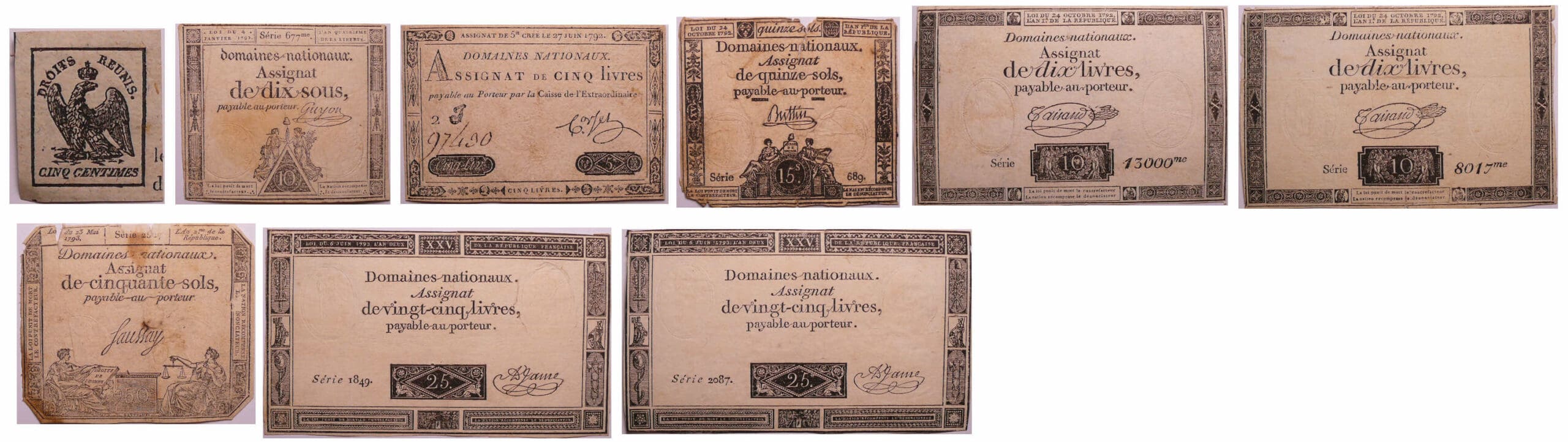 Lot de 7 assignats et un timbre de 5 centimes