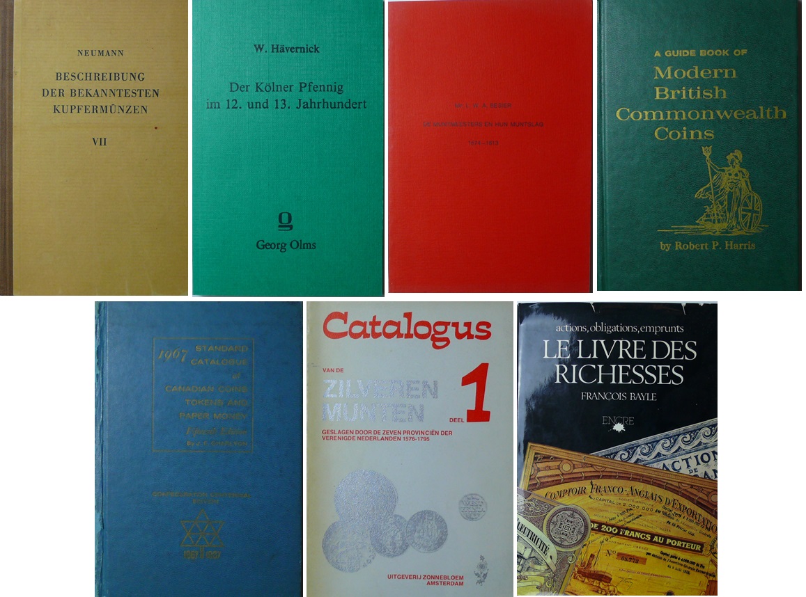 Avers : 1- Beschreibung der bekanntesten kupfermünzen, volume VII, Josef Neumann ; 2- Der Kölner pfennig im 12. und 13. jahrhundert, periode der territorialen pfennigmünze, Walter Hävernick 1984 ; 3- De muntmeesters en hun muntslag 1574-1813, Mr. L.W.A. Besier ; 4- A guide book of modern british commonwealth coins, Robert P. Harris 1970 ; 5- Standard catalogue of canadian coins tokens and paper money, J. E. Charlton 1967 ; 6- Catalogus van de zilveren munten geslagen door de zeven provinciën der verenigde nederlanden 1576-1795, deel 1, derde editie ; 7- Le livre des richesses, actions, obligations, emprunts, François Bayle 1979.