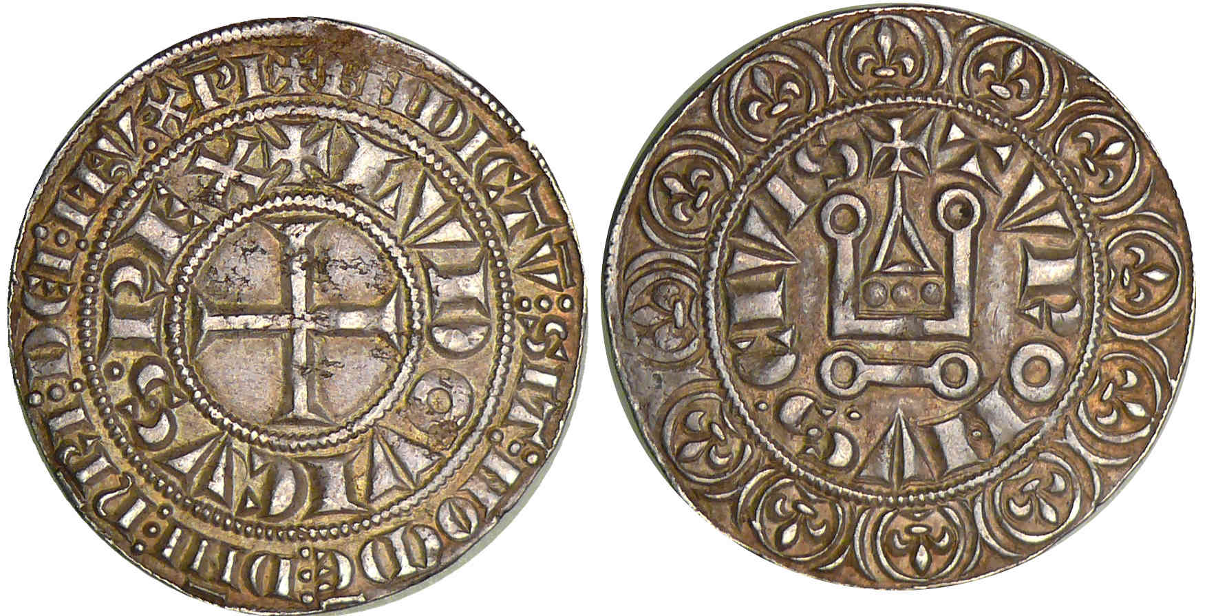 R/ + TVRONVS CIVIS. Châtel tournois sommé d’une croisette ; bordure extérieure de douze lis.