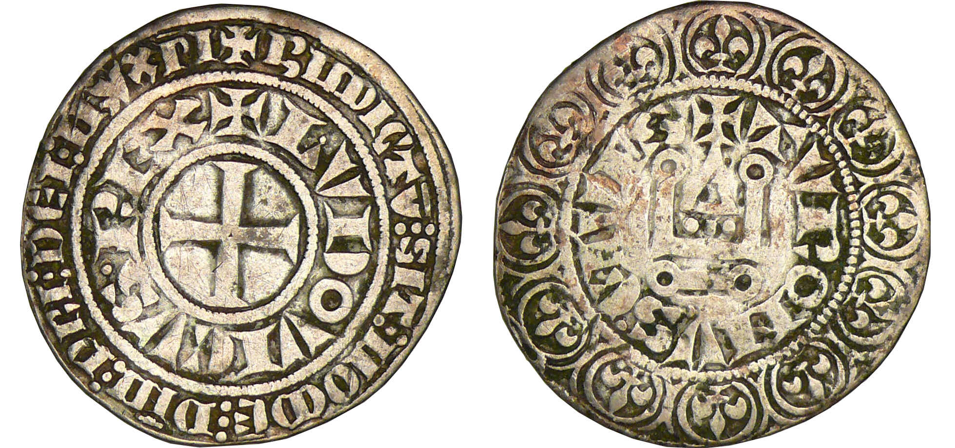 R/ + TVRONVS CIVIS. Châtel tournois sommé d’une croisette ; bordure extérieure de douze lis.