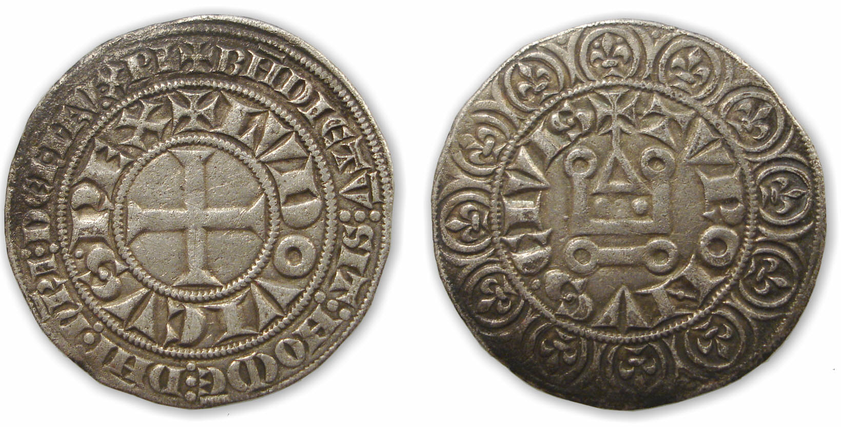 Revers : R/ + TVRONVS• CIVIS. Châtel tournois sommé d’une croisette, bordure extérieure de douze lis.