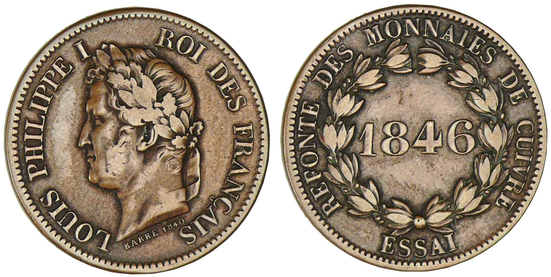 R/ REFONTE DES MONNAIES DE CUIVRE // ESSAI. 1846 dans une couronne d’olivier.