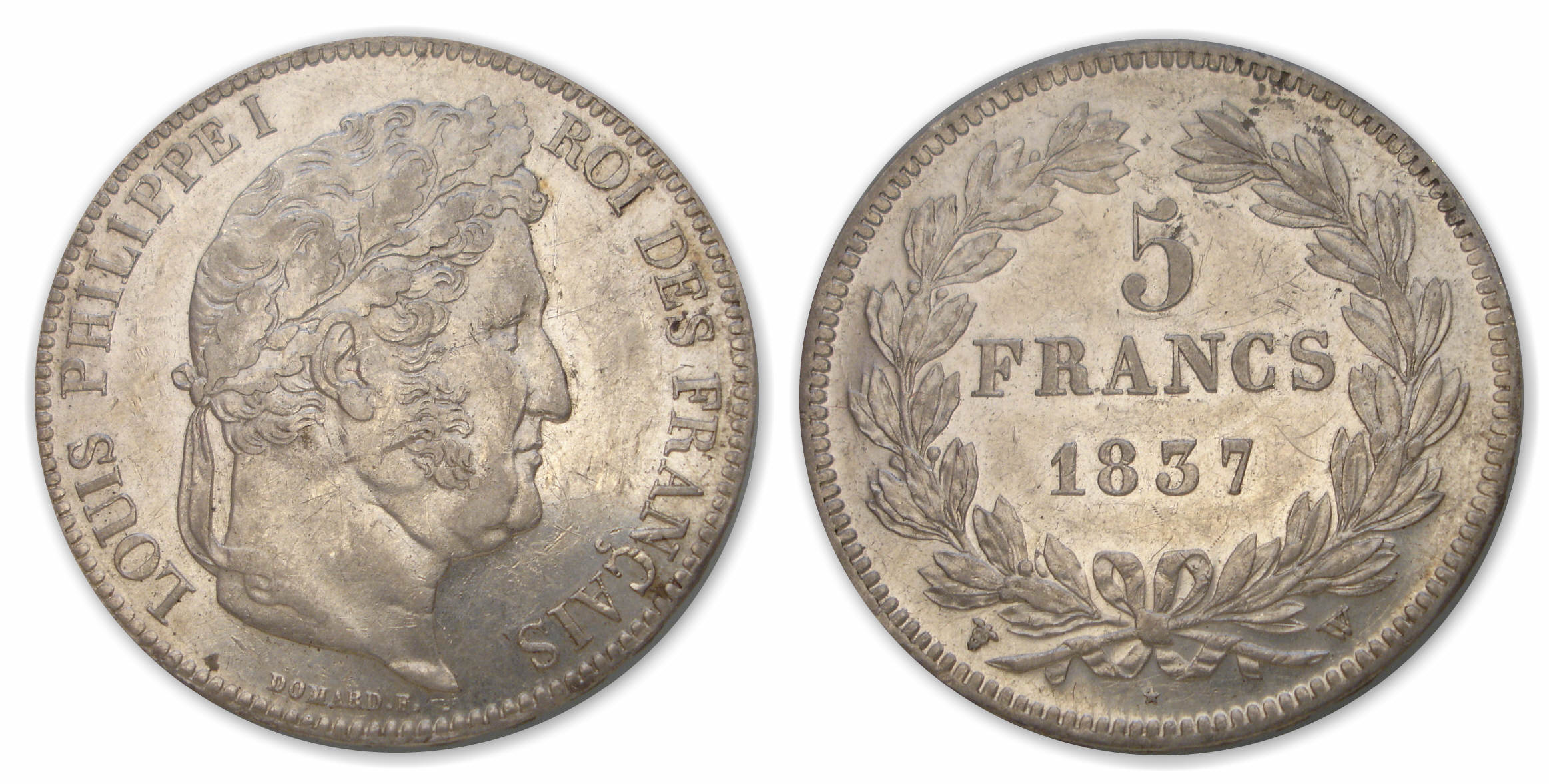 Louis-Philippe Ier (1830-1848) – 5 francs tête laurée 3ème type 1837 W (Lille)