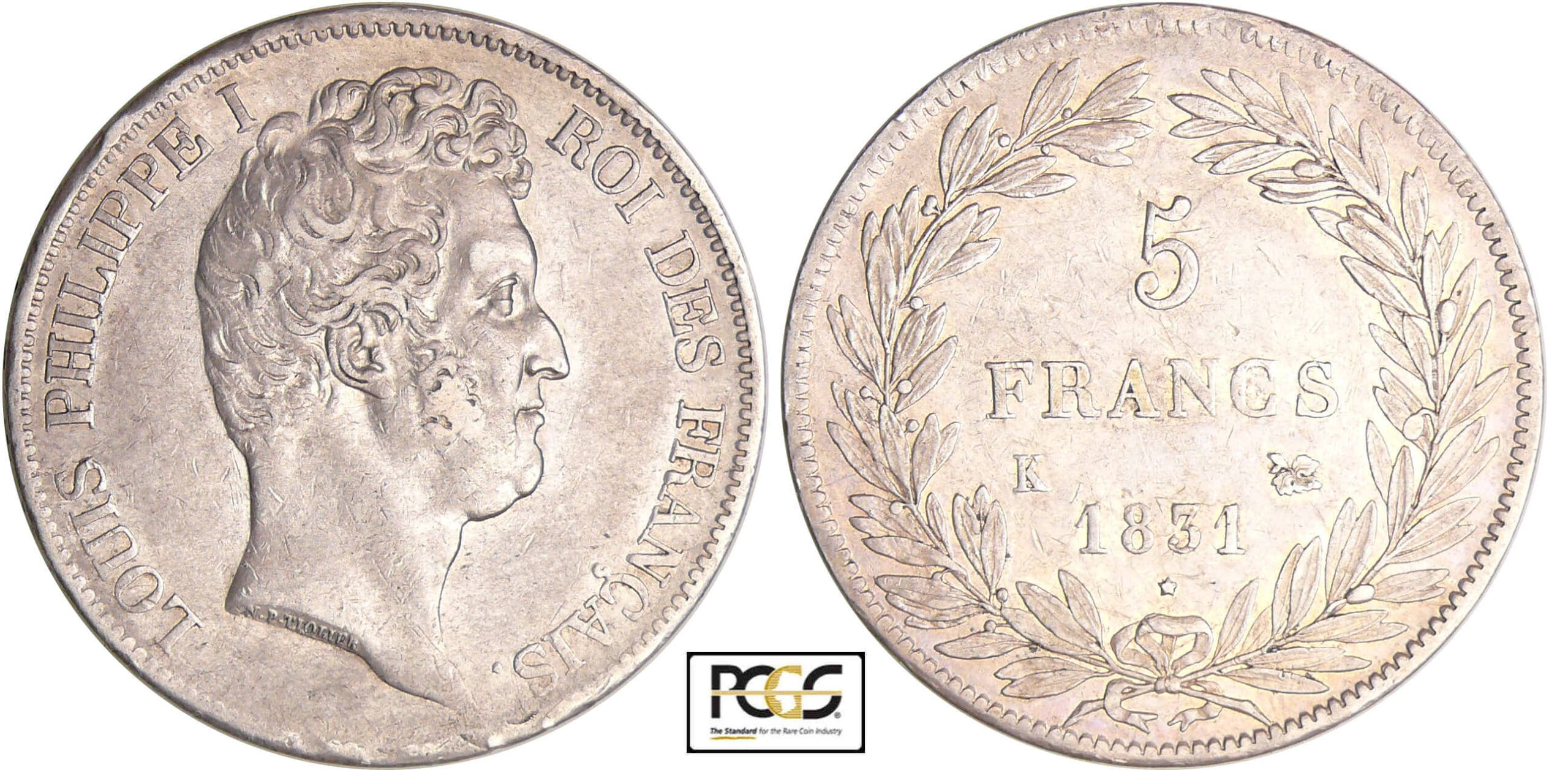 / Louis-Philippe Ier (1830-1848) – 5 francs tête nue tranche en creux 1831 K (Bordeaux)