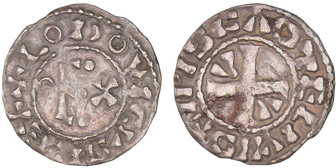 Avers : A/ + LODOVICVS REX. Grand E accosté à gauche d’un annelet, à droite de trois besants posés en pal, et d’une croisette.
