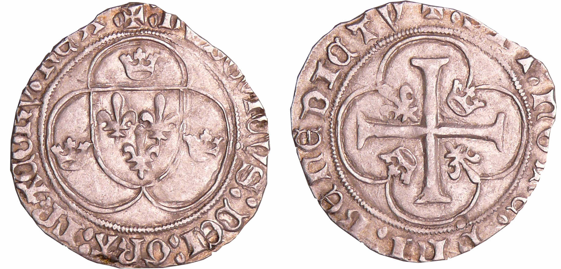 Avers : A/ + LVDOVICVS* FRAnCORV* REX. Ecu de France entre trois couronnelles, dans un double trilobe.