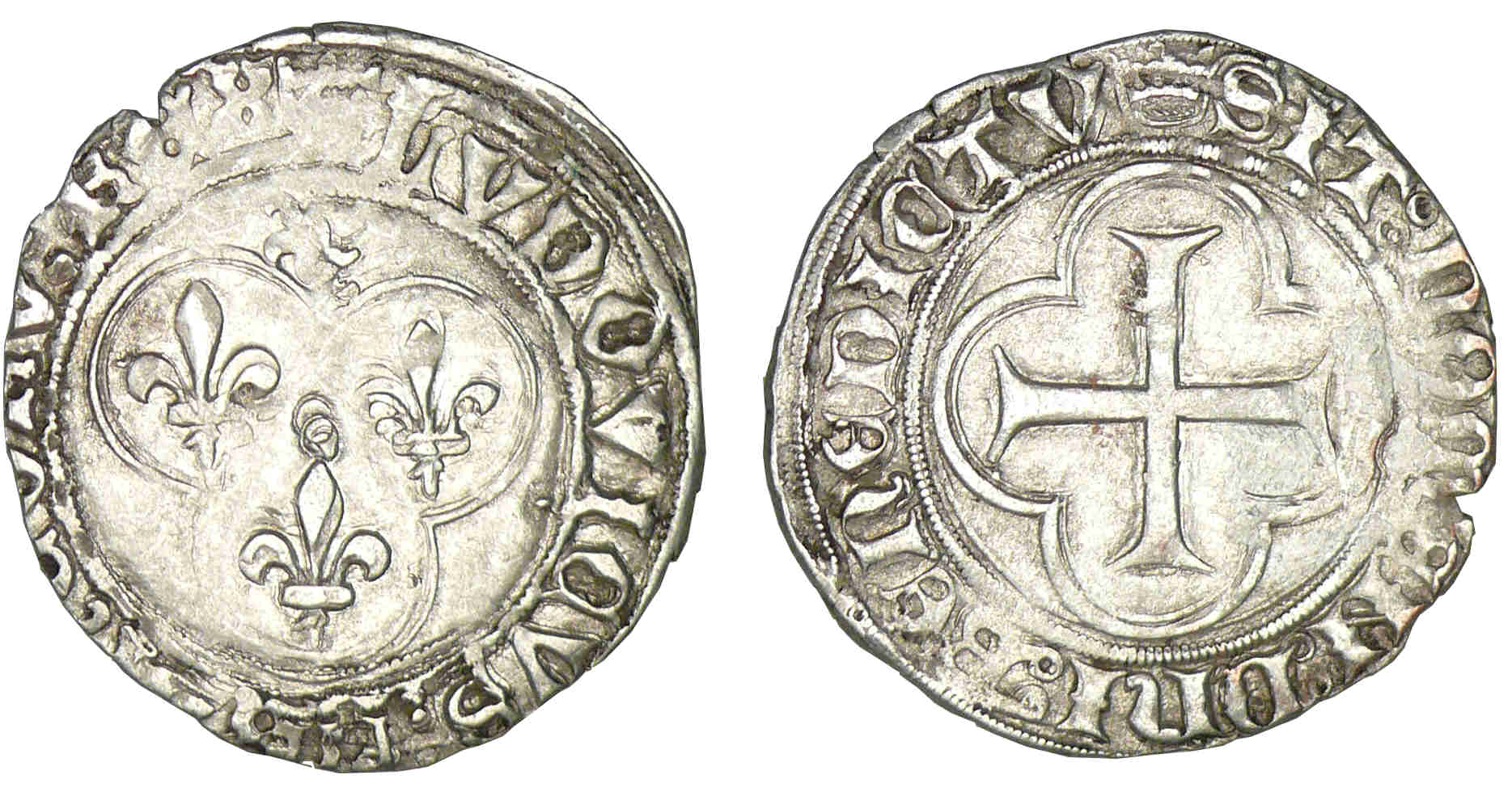 A/ (Couronnelle) LVDOVICVS FRANCRVM REX. Trois lis dans un trilobe sommé d’un soleil.