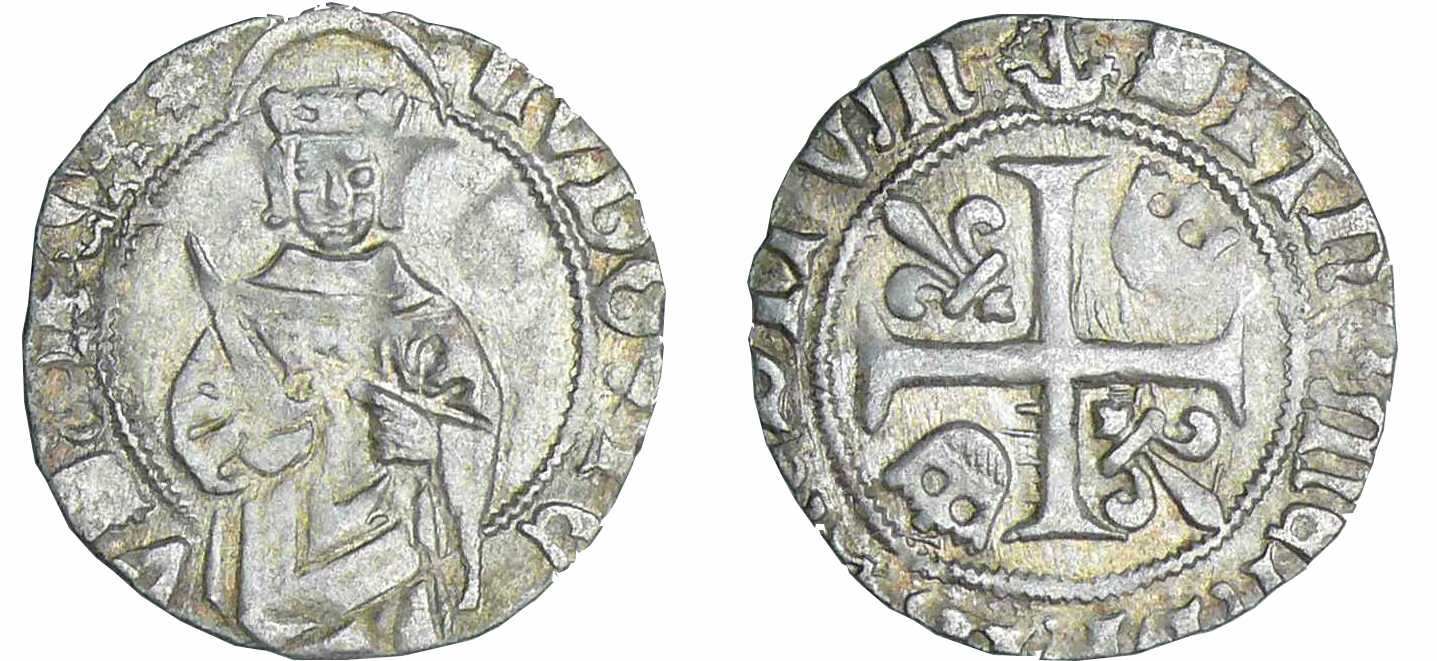 A/ LVDOVICVS (lis) DEI (lis) GRACIA (nef)• Le roi de face à mi-corps, couronné et tenant une épée.