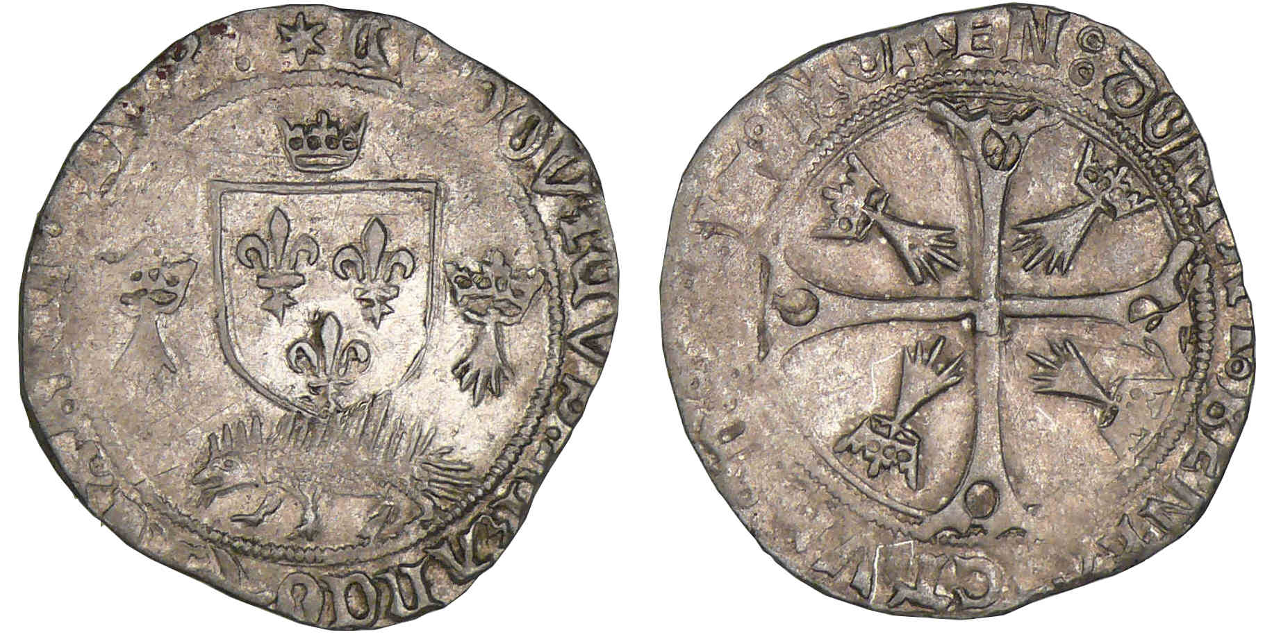 Avers : A/ } LVDoVI6VS: FRANCo: REX: BRITo: DVX: – Ecu de France sommé d’une couronnelle et accosté de deux mouchetures d’hermine couronnées, posé sur un porc-épic.