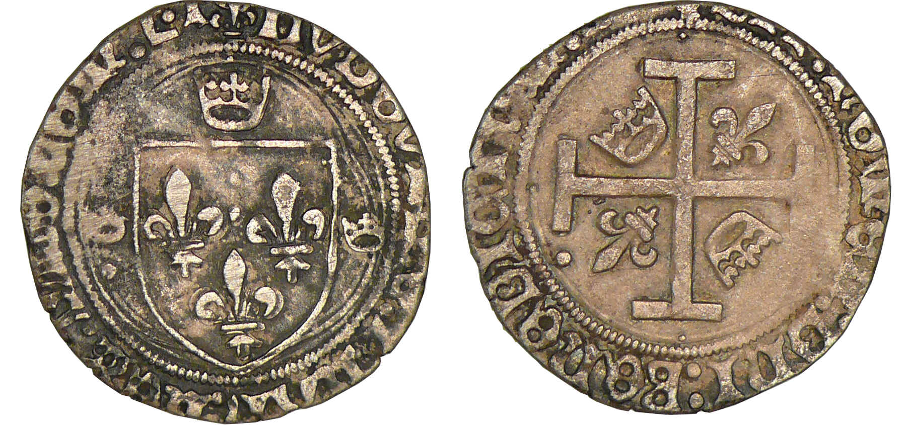 A/ (lis couronné) LVDOVICVS:FRANCORVM:REX:L•T. Ecu de France entre trois couronnelles dans un trilobe.