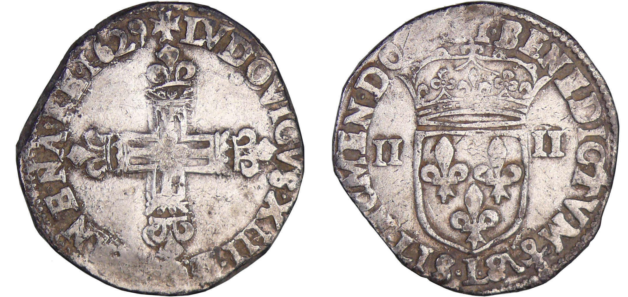 Louis XIII (1610-1643) – ¼ d’écu à la croix fleurdelisée, avers côté croix – 1629 L (Bayonne)