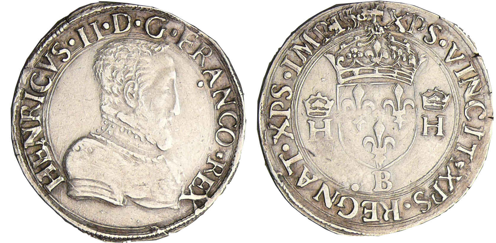 R/. (Mm). XPS. VINCIT. XPS. REGNAT. XPS. IMP (Mm) Ecu de France couronné accosté de deux H couronnés. Lettre d’atelier à la pointe de l’écu.
