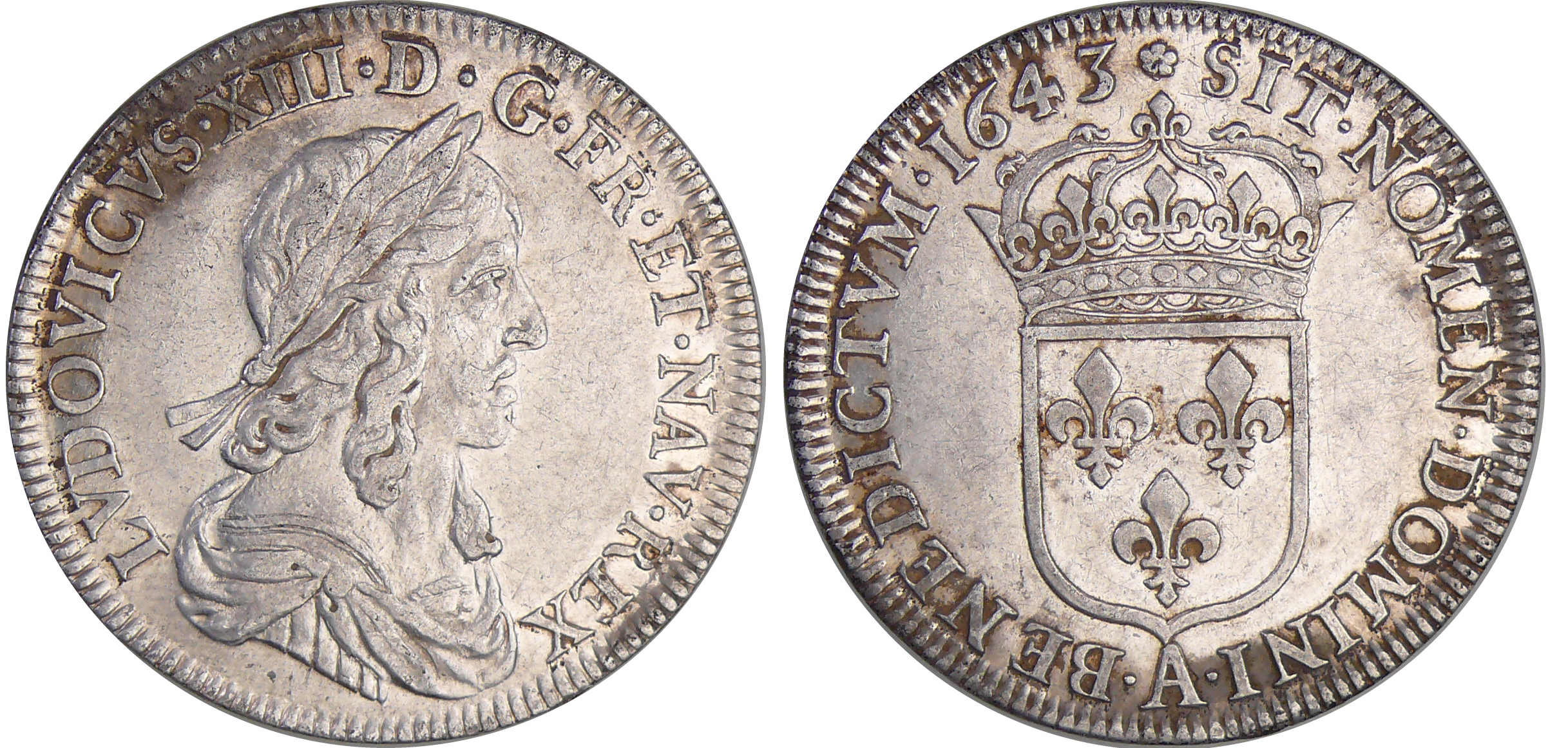 Louis XIII (1610-1643) – ½ écu du 2ème poinçon de Warin – 1643 A (Paris) Rose et sans baies dans les cheveux