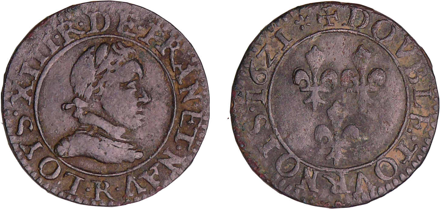 / Louis XIII (1610-1643) – Double tournois au buste enfantin et col plat – 1621 R (Villeneuve)