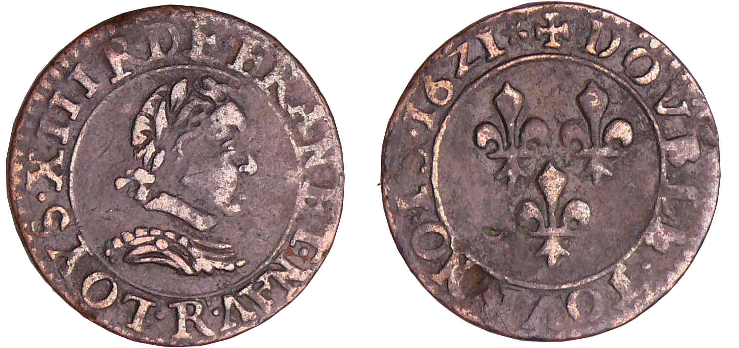 / Louis XIII (1610-1643) – Double tournois au buste enfantin et col plat – 1621 R (Villeneuve)