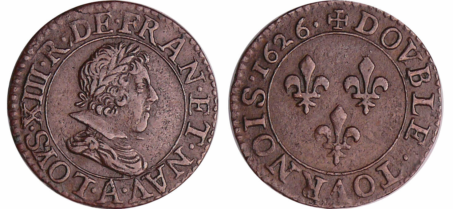 / Louis XIII (1610-1643) – Double tournois au buste juvénile et col plat – 1626 A (Paris)