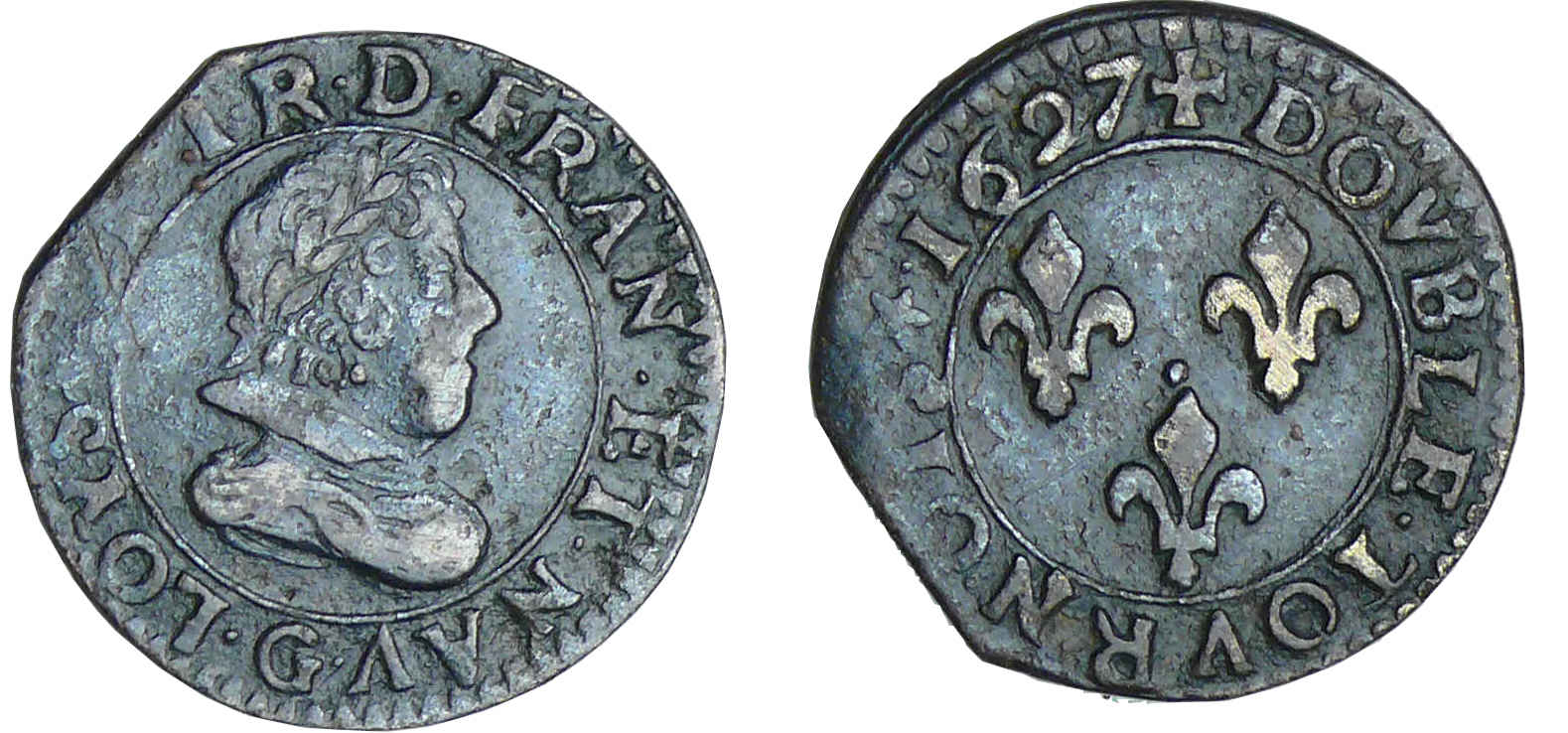 Louis XIII (1610-1643) – Double tournois au buste juvénile et col plat – 1627 G (Poitiers)