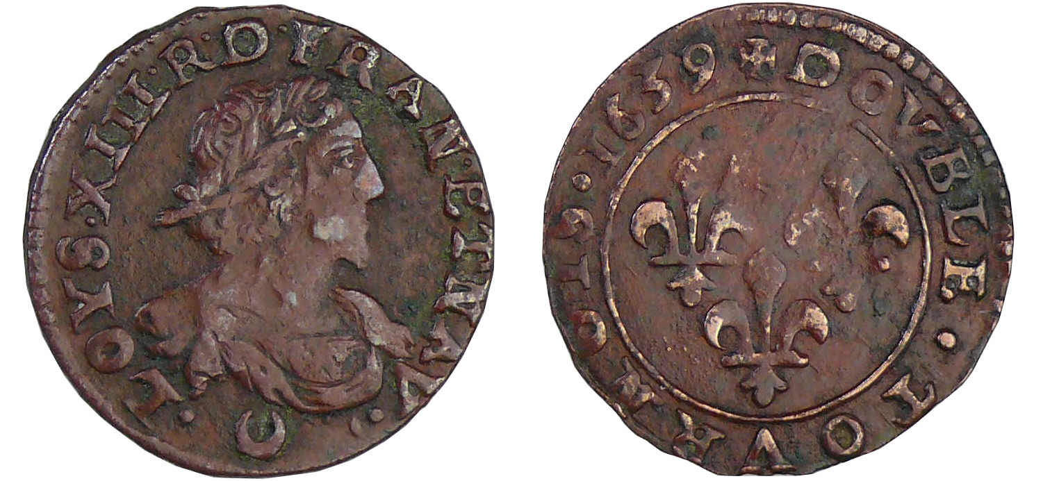 / Louis XIII (1610-1643) – Double tournois au buste viril drapé à l’antique – 1639 .ᴗ. (Axe Loire-Rhône)