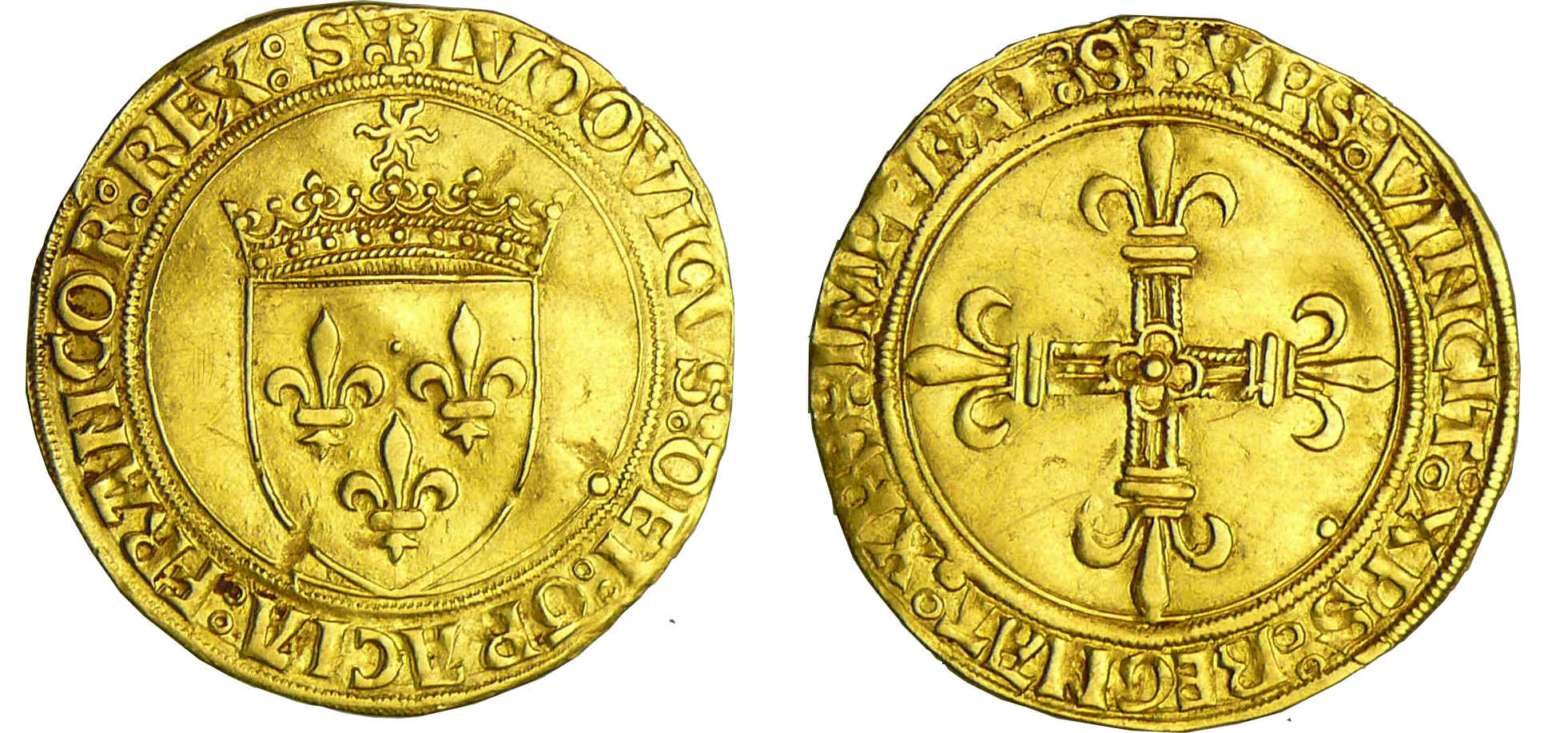 Avers : A/ (lis couronné) LVDOVICVS: DEI: GRACIA: FRANCORV: REX: Ecu de France couronné sous un soleil.