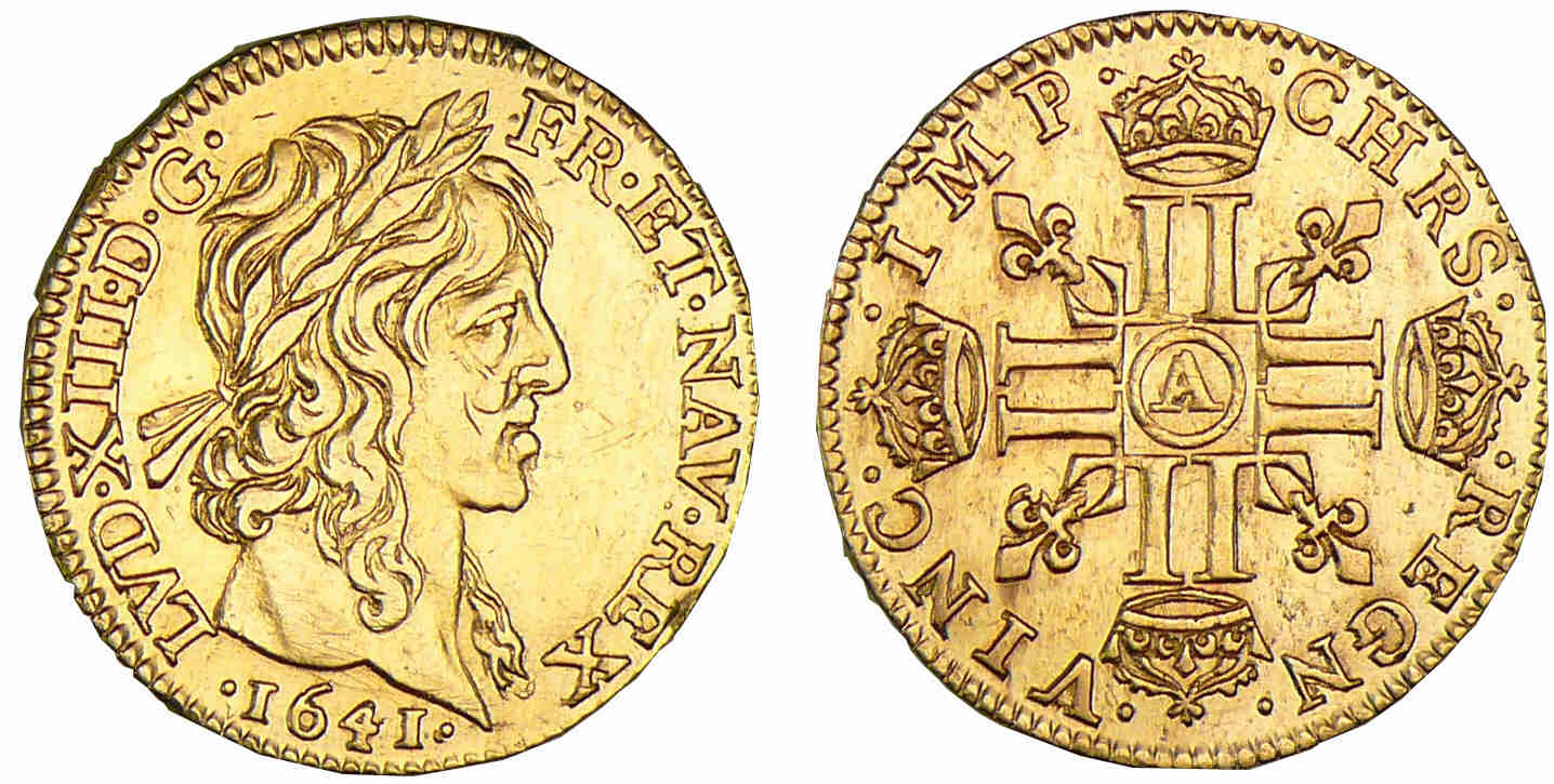 Avers : A/ LVD. XIII. D. G. – FR. ET. NAV. REX. Tête laurée à droite, la mèche longue sans baie dans la couronne.