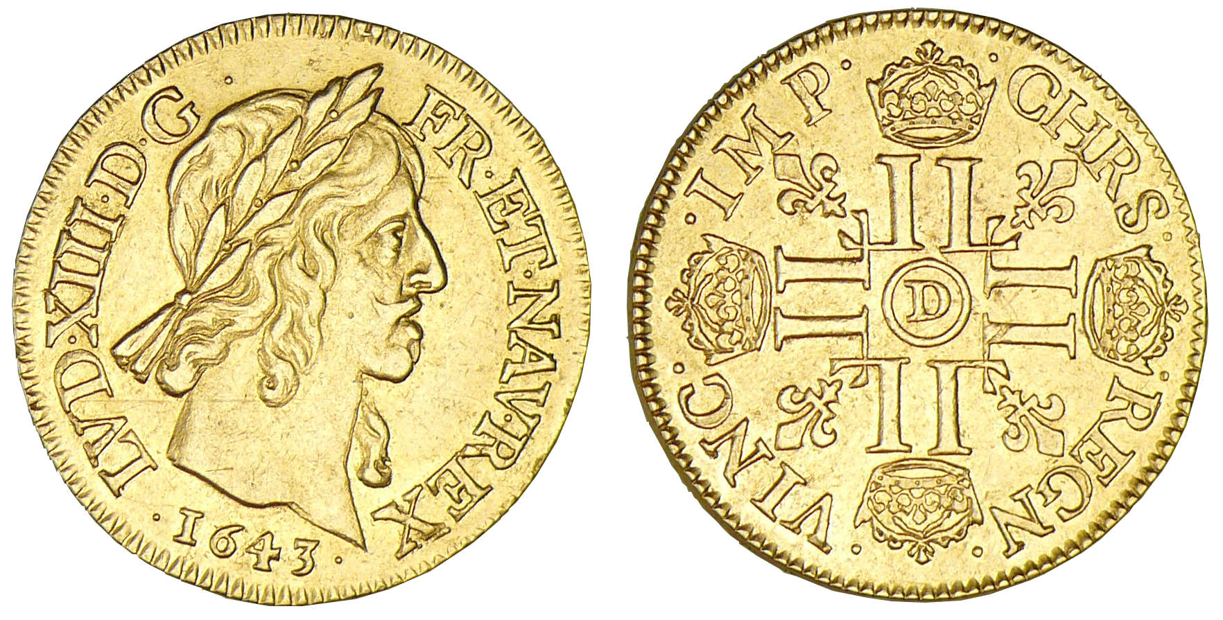 Avers : A/ LVD. XIII. D. G. – FR. ET. NAV. REX. Tête laurée de Louis XIII à droite, la mèche longue sans baie dans la couronne.
