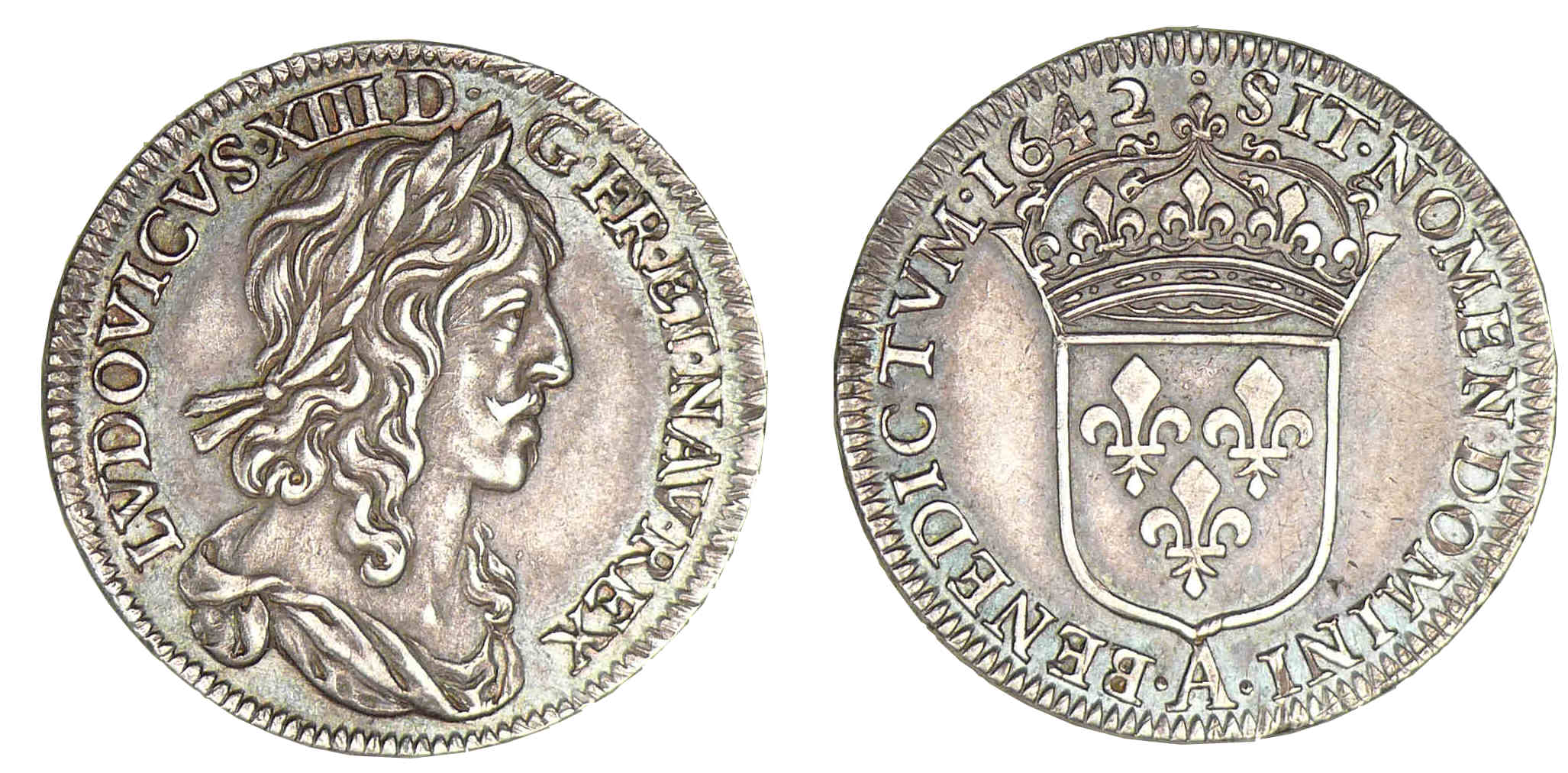 Avers : A/ LVDOVICVS XIII D G FR ET NAV REX. Buste lauré et drapé à droite.