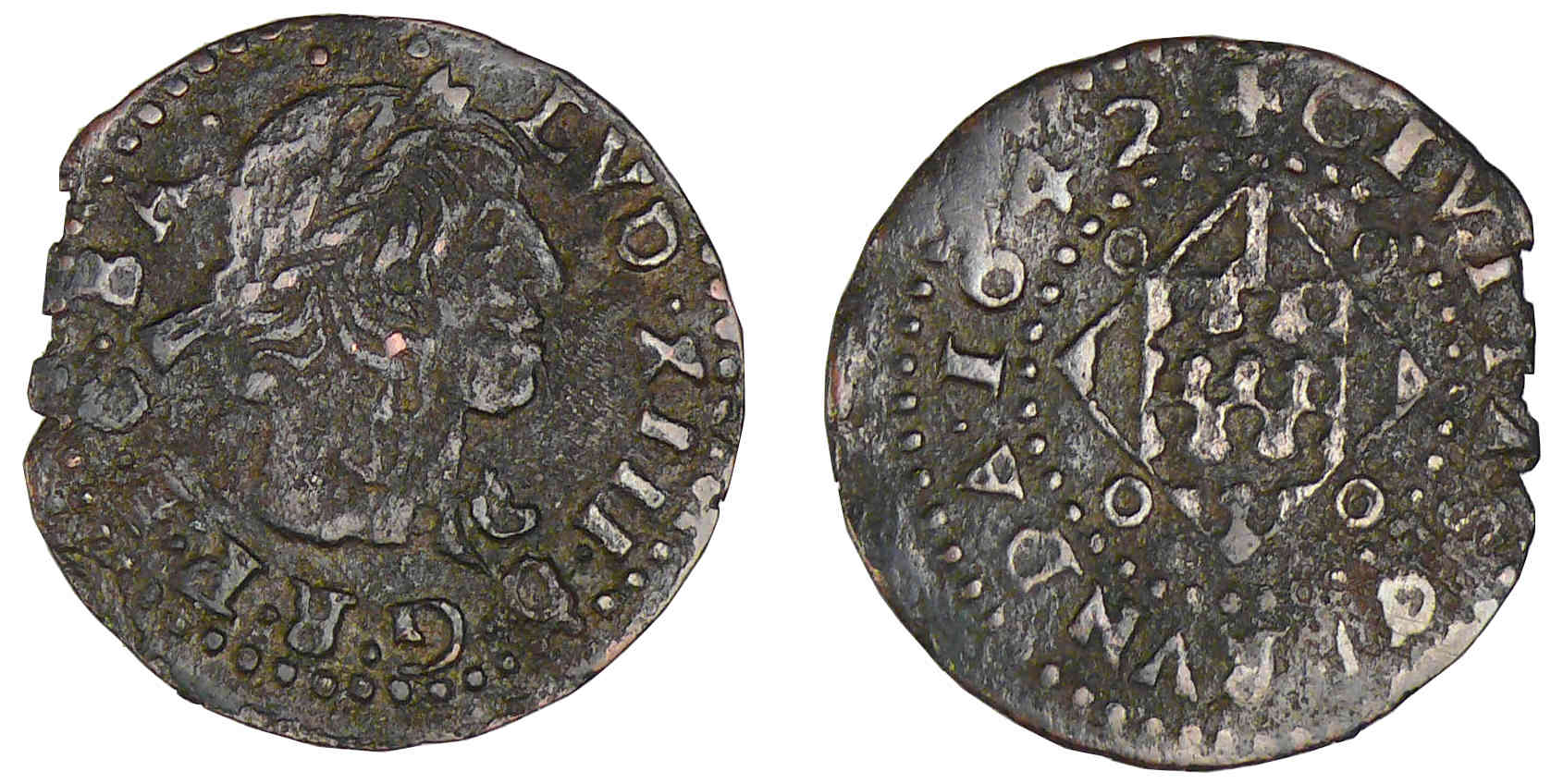 Revers : R/ R/ + CIVITAS: GERVNDA 1642. Ecu losangé de Gérone, accosté de quatre annelets.