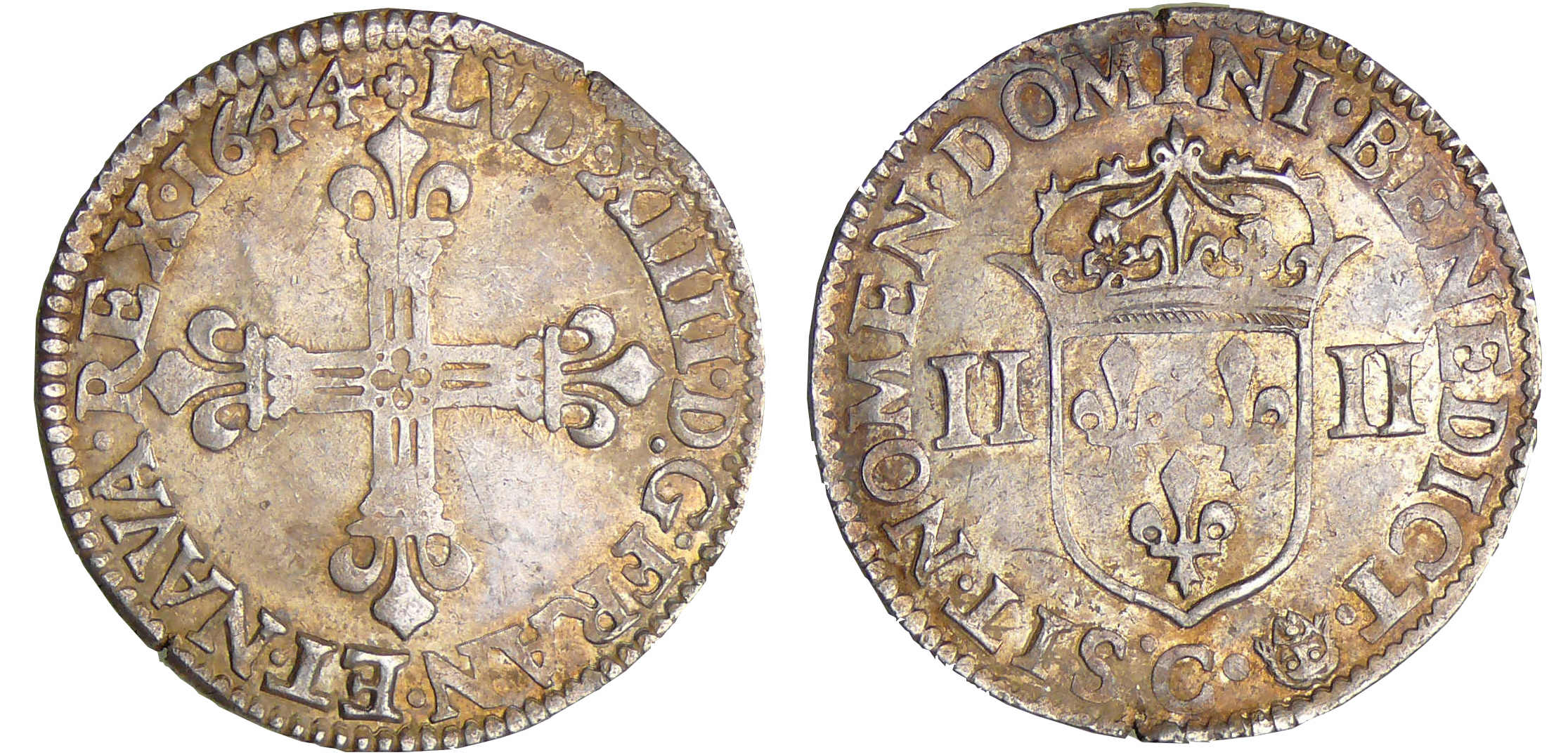 / Louis XIV (1643-1715) – ¼ d’écu, frappe au marteau, avers côté croix – 1644 C (Saint-Lô)