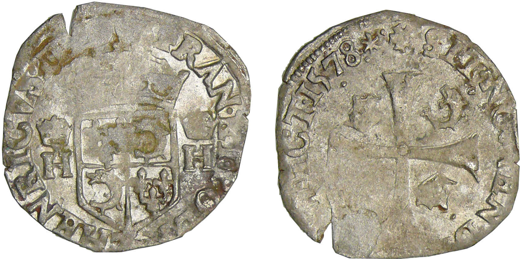A/. HENRICVS. III. D. G. FRAN. ET. POL. REX. Ecu de France-Dauphiné couronné et accosté de deux H couronnés.