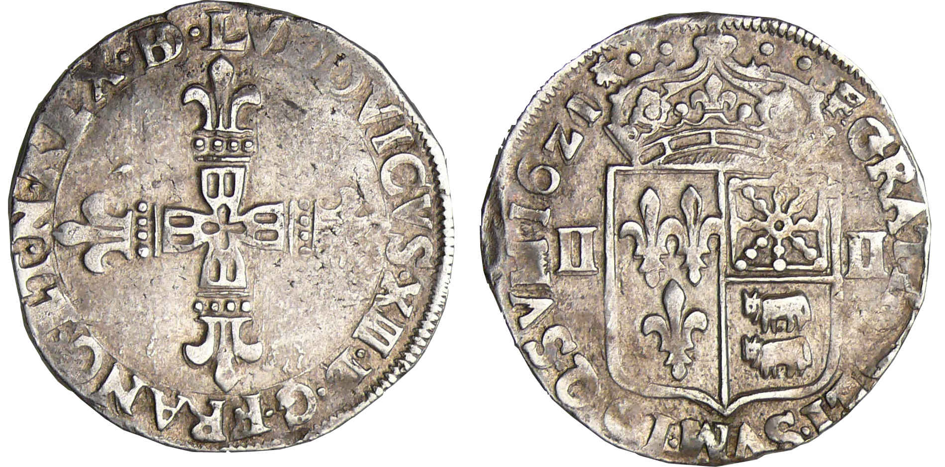 Louis XIII (1610-1643) – ¼ d’écu de Béarn à la croix fleurdelisée – 1621 F (Pau) 21 sur 20