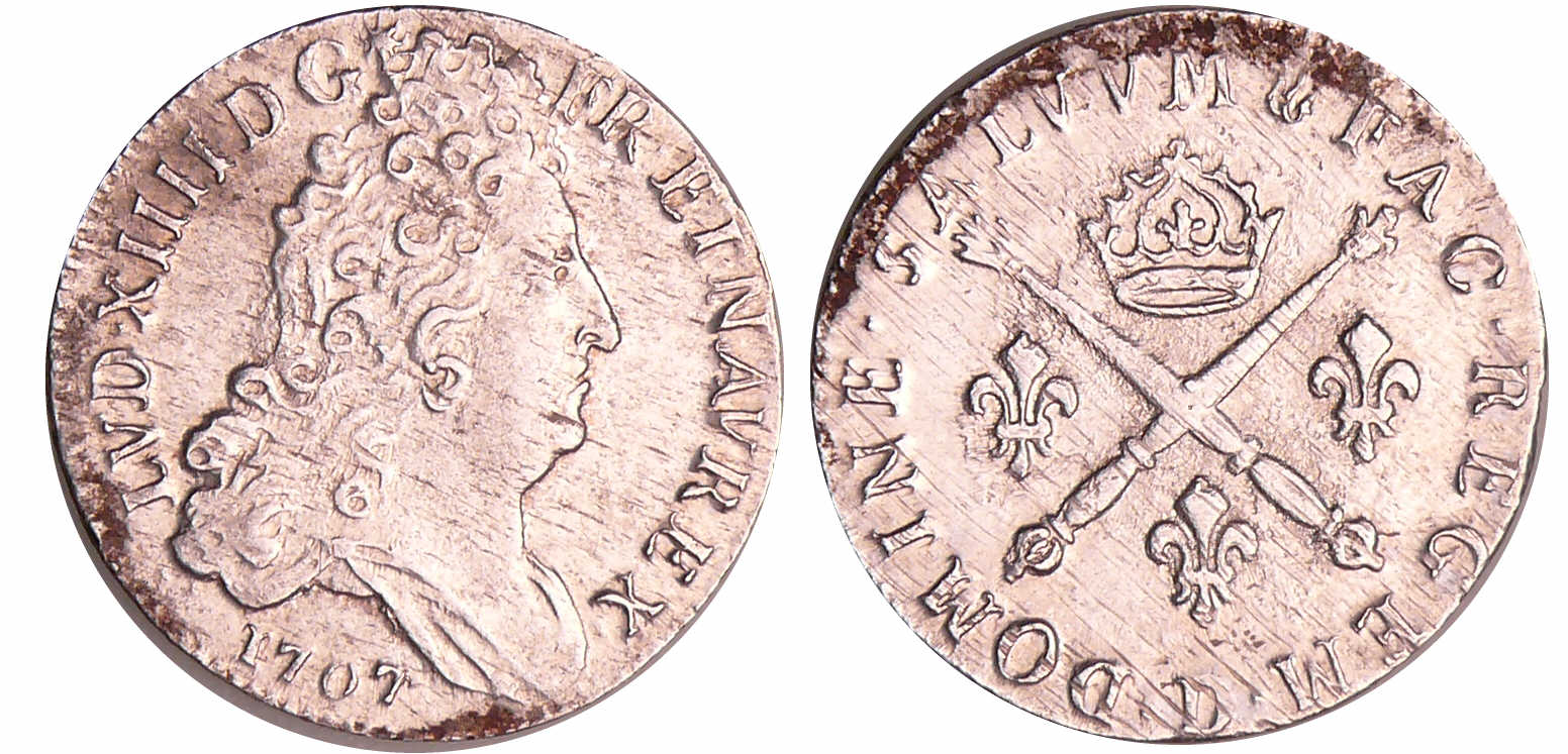 / Louis XIV (1643-1715) – 10 sols aux insignes – 1707 D (Lyon)