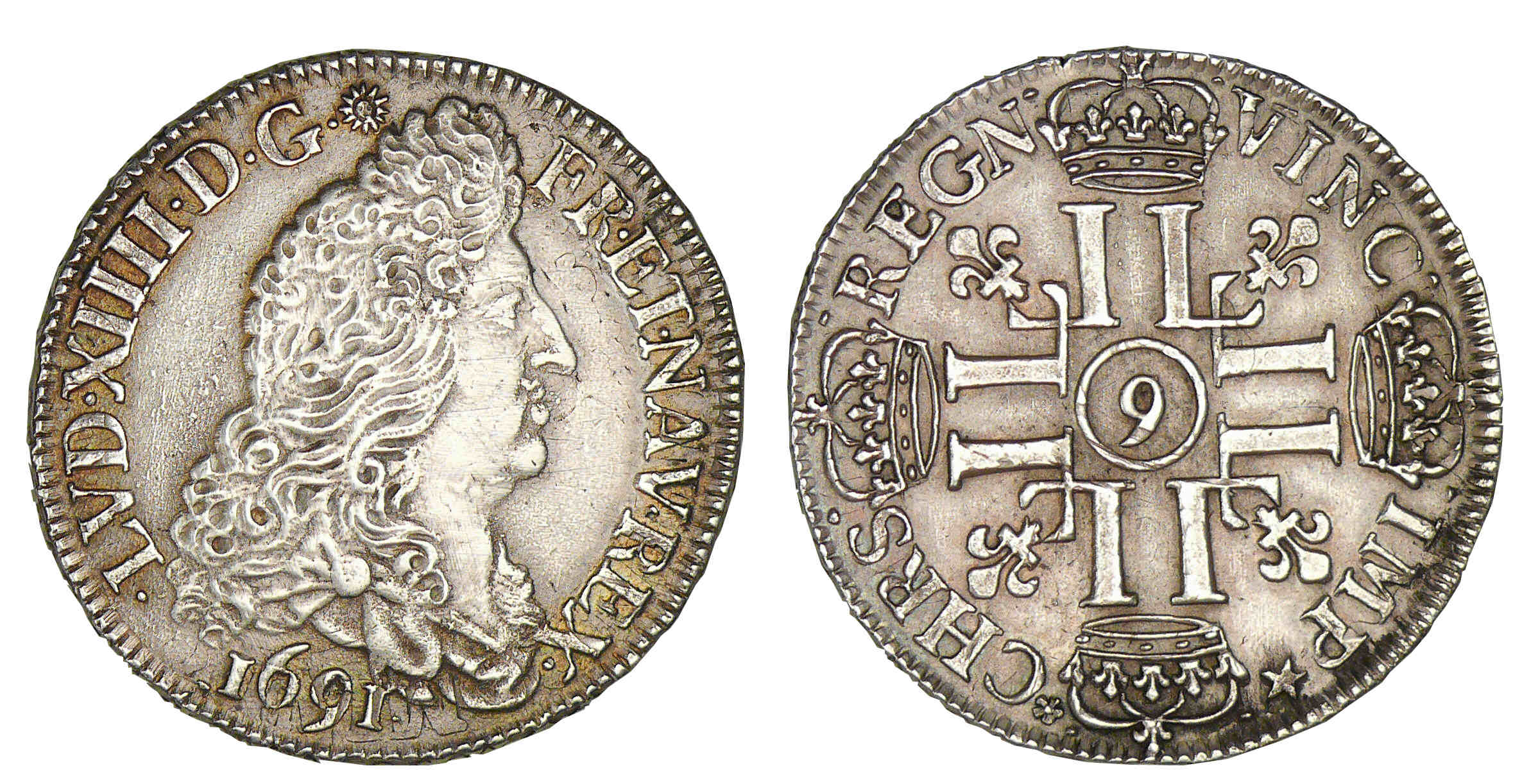 Avers : A/ LVD. XIIII. D. G. FR. ET. NAV. REX. Buste du roi drapé à droite (millésime).