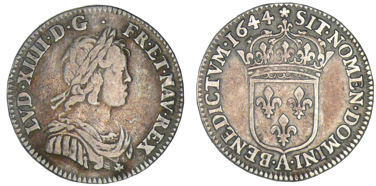 Louis XIV – Douzième d’écu à la mèche courte – 1644 (rose) A (Paris)