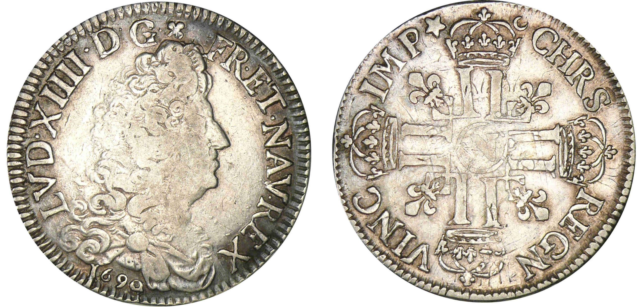 / Louis XIV – Ecu aux 8 L 1er type 1690 N (Montpellier)