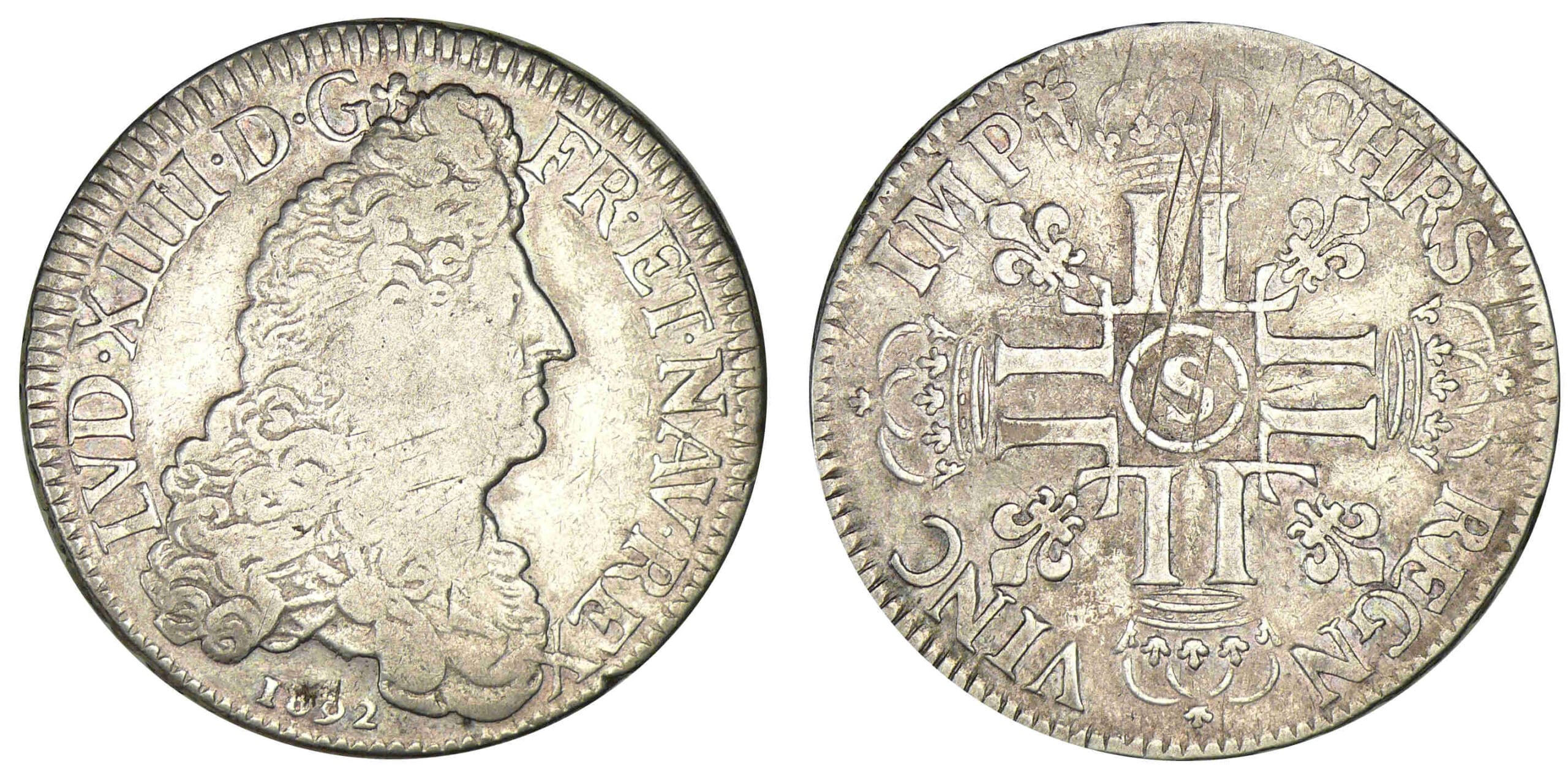 Avers : A/ LVD. XIIII. D. G. FR. ET. NAV. REX. Buste du roi drapé à droite (millésime).