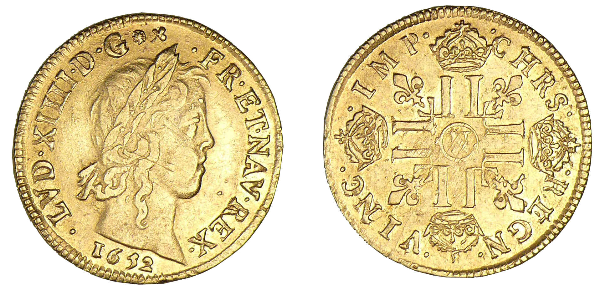 Avers : A/ LVD. XIIII. D. G. FR. ET. NAV. REX. Buste lauré et drapé à droite.