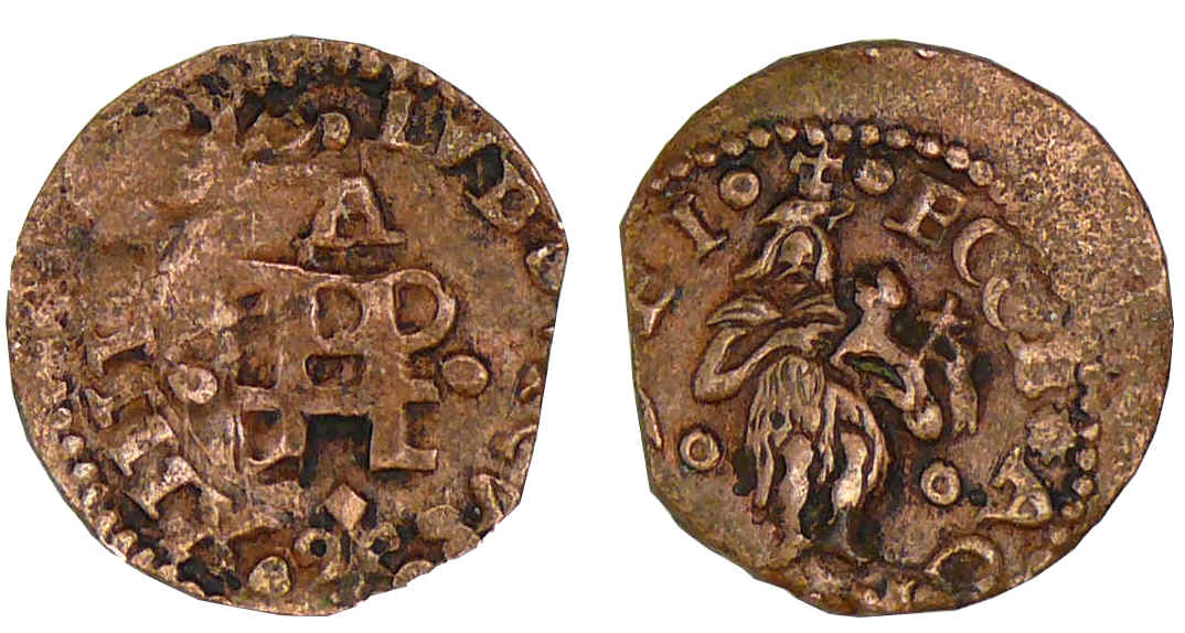 R/ o+o ECCE (rose) AGNVS o DEI. Saint Jean-Baptiste tenant un agneau.